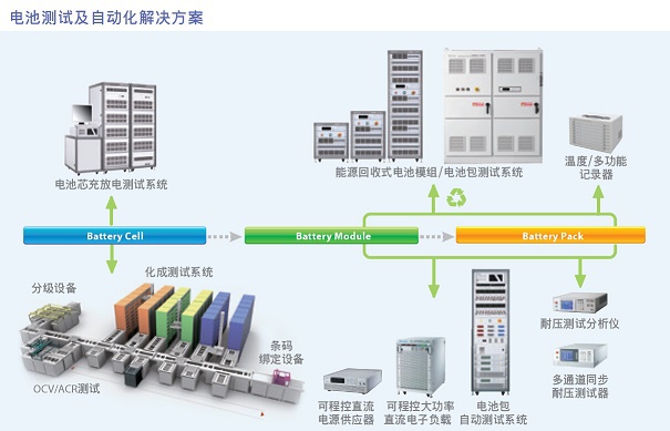 电池测试是一个十分复杂而且关键的过程,需要准确、精细、快速、可靠的测试设备和系统。而Chroma 电子所提供的电池测试方案,则具备全面性、多样性和先进性,能够帮助客户进行充电、放电、容量、效率、循环寿命、温度及安全性等方面的综合测试,并实现精确、实时、远程和批量的数据采集和分析。在这个复杂的测试过程中,使用了不同种类的仪器,包括电子负载、电压电流源、直流电源、电池测试仪及自动化测试系统等。
