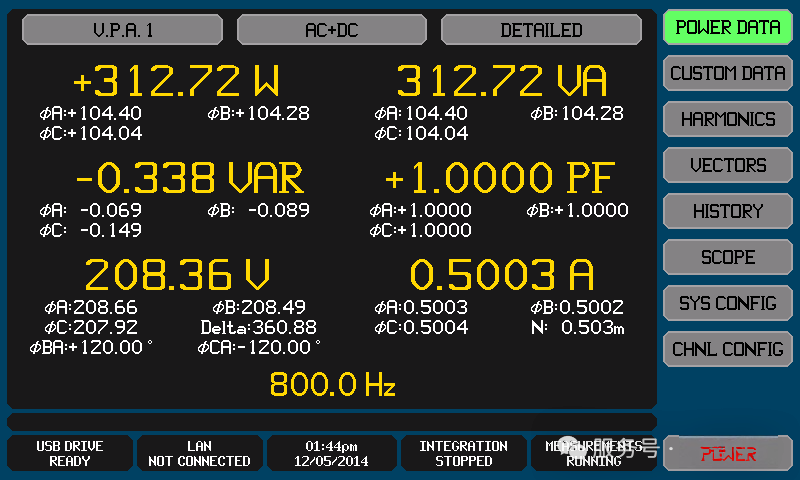 功率数据屏幕(图2)可一键显示任意选定通道或虚拟功率分析仪(VPA)组的V、A、W、VA、VAR 和 PF 数据,还能查看峰值读数、相位、CF 等参数,甚至可控制和查看集成数据结果(WHr)。
