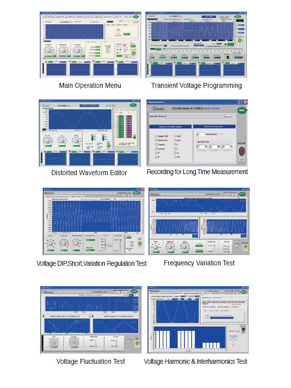 Chroma61504可编程交流电源提供图形化接口的控制软件, 提供简易设定及操作, 可执行所有的功能. 并内建测试法规. 并可以长时间记录量测值, 存成档案供分析。
