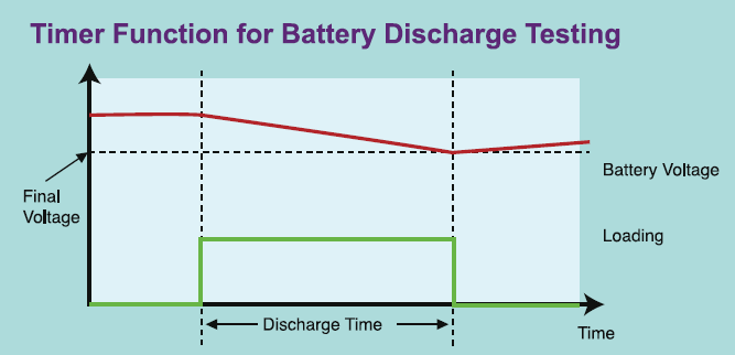 针对电池放电测试,63200A提供使用者三种放电模式 : 定电流、定电阻与定功率模式,并透过设定截止电压与停止时间(1秒~100,000秒),让电子负载能正确的停止拉载,确保电池不会因过度放电而损坏。除此之外,在量测方面,能测量电池的放电电量(WH、AH)与总放电时间。举例说明 : 当按下Load ON开始拉载,63200A系列的内部计时器会开始进行计数,直到电池电压降至所设定的截止电压或按下Load OFF停止拉载,计时器才会停止计数。电池放电测试功能亦可应用在超电容的放电时间测试和其他相同应用等。