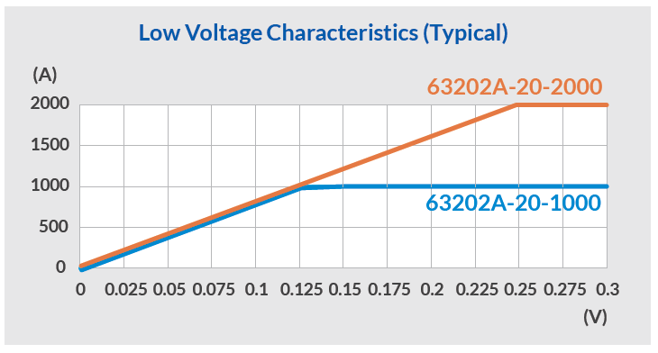 低压大电流电子负载,具有卓越的低电压特性,特别是63202A-20-2000型号,其负载端最小操作电压可达0.25V,在此电压下提供高达2,000A的最大额定电流。需特别注意若受线材压降影响,导致负载端低于0.25V,则无法提供2,000A之电流。此外,即使在电压低于0.25V至0V区间内,该设备仍能拉载电流,展现出稳定的性能,可参考低电压操作特性V-I曲线图*