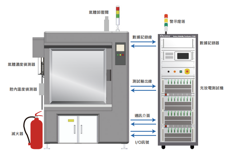 Chroma 17010系统在安全性设计上提供软/硬体侦测保护、设备异常监控和可选配的独立外部仪表继电器硬件侦测防护三大安全机制,保障锂离子电池芯测试实验安全。