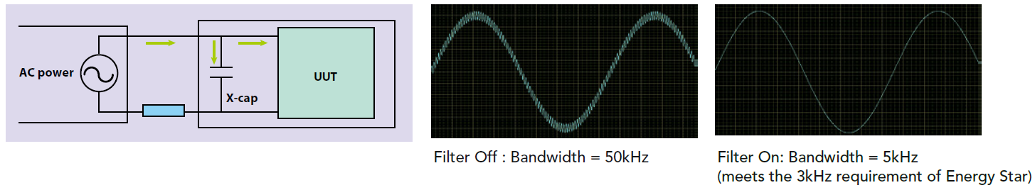 66203/66204不仅提供平均模式,也提供了移动窗口法,让用户设定时间长度,量测时会计算窗口内所有数据,所以不会遗漏任何讯号。除此之外也提供能量累积模式(Integration Mode)来量测功率。这种积分模式由用户设定一段时间,在此时间内会对电压及电流的瞬间功率积分,得到能量(焦耳)。将能量再除以时间,这样就得到没有状况遗漏的真正平均功率。66203/66204数字功率表提供5mA及波峰因素为4的电流档位,在小功率(<10W)有0.1mW的分辨率,小于2%的不确定度,非常适用于量测空载功率的应用。这些功能让66203/66204数字功率表满足能源之星ENERGY STAR / IEC 62301 / ErP / SPEC Power 的测试需求。
