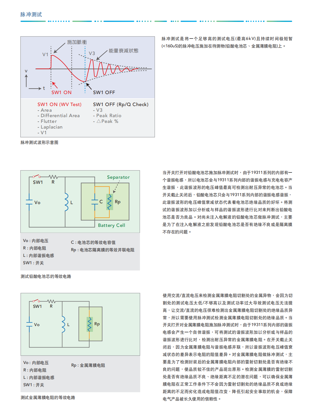 Chroma 19311系列脉冲测试仪可对尚未注入电解液的铅酸电池芯施加高压脉冲来检测正负极板之间的绝缘品质以及对金属薄膜电阻施加高压脉冲来检测雷射切割处等的绝缘品质。
