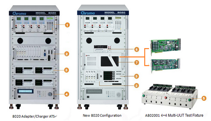 Chroma 8020 配接器/充电器自动测试系统是在生产线上测试配接器与充电器的测试系统,8020可支援同时一次测试多颗待测物,大幅提升生产线产能,并且兼具 Chroma 8000系统灵活的硬体架构,可选择多种硬体例如交流电源供应器、电子负载、时序/杂讯分析仪、功率表等。