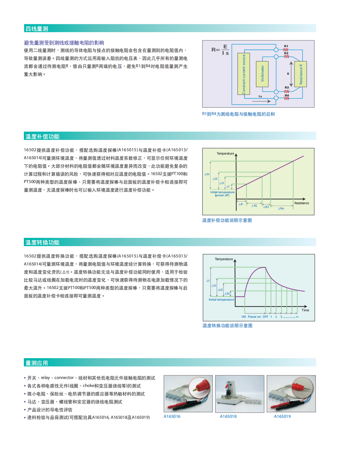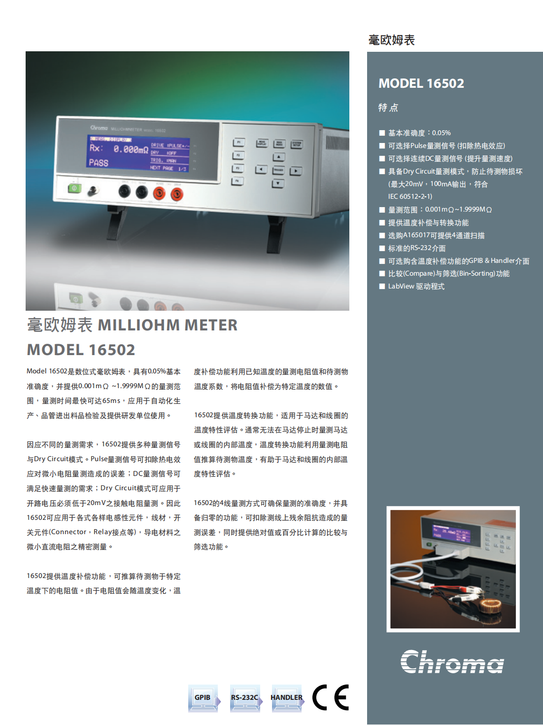 Model 16502是数位式毫欧姆表,具有0.05%基本准确度,并提供0.001mΩ~1.9999MΩ的量测范围,量测时间最快可达65ms,应用于自动化生产、品管进出料品检验及提供研发单位使用。