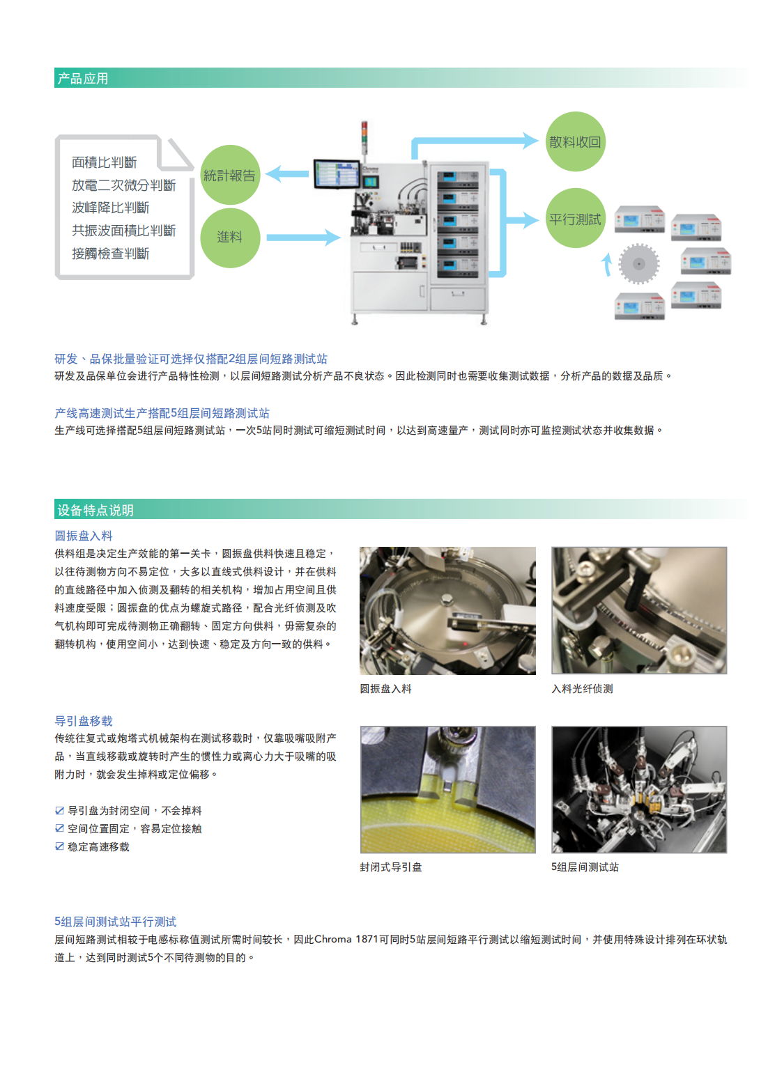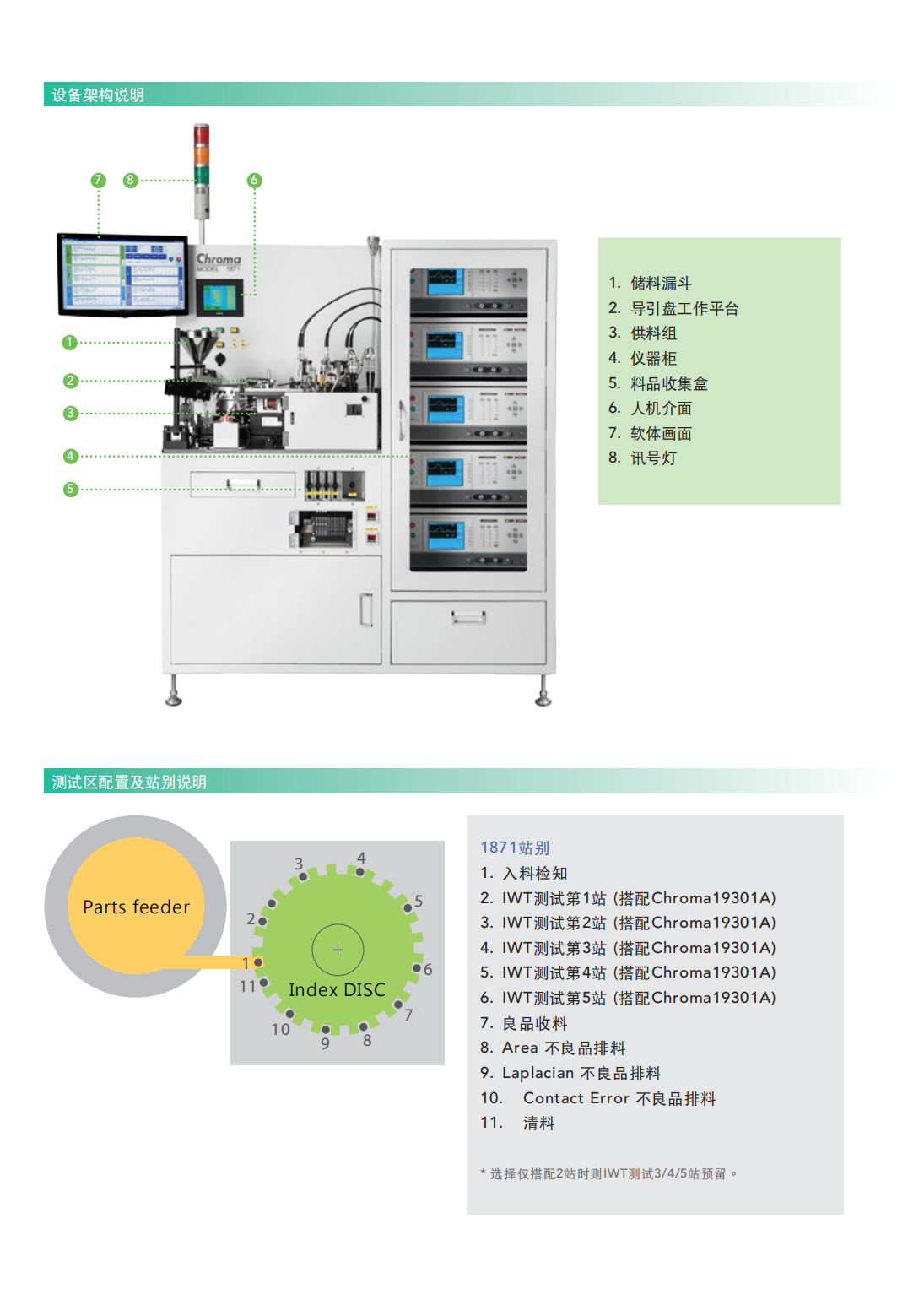 Chroma 1871是专门为晶片型电感所设计的自动化测试生产设备,特别针对层间短路测试而设计,满足客户端大量生产需求。